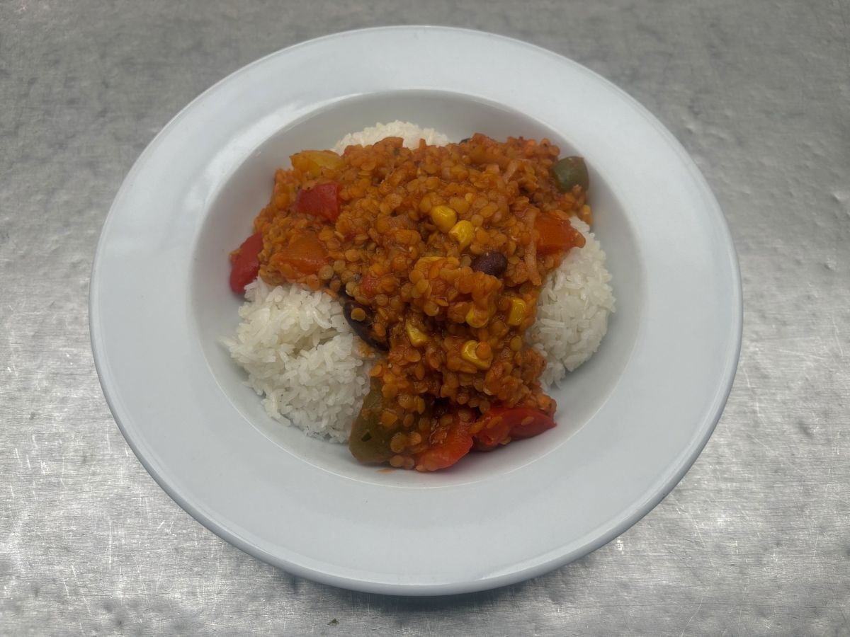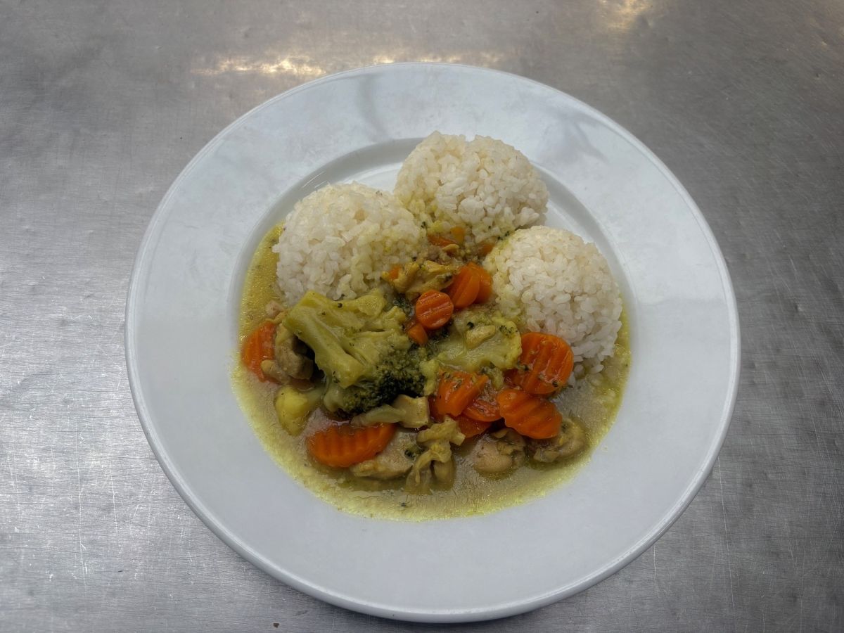 Váha: 140/200 Chicken ragout withvegetables; steamed rice; carrot salad