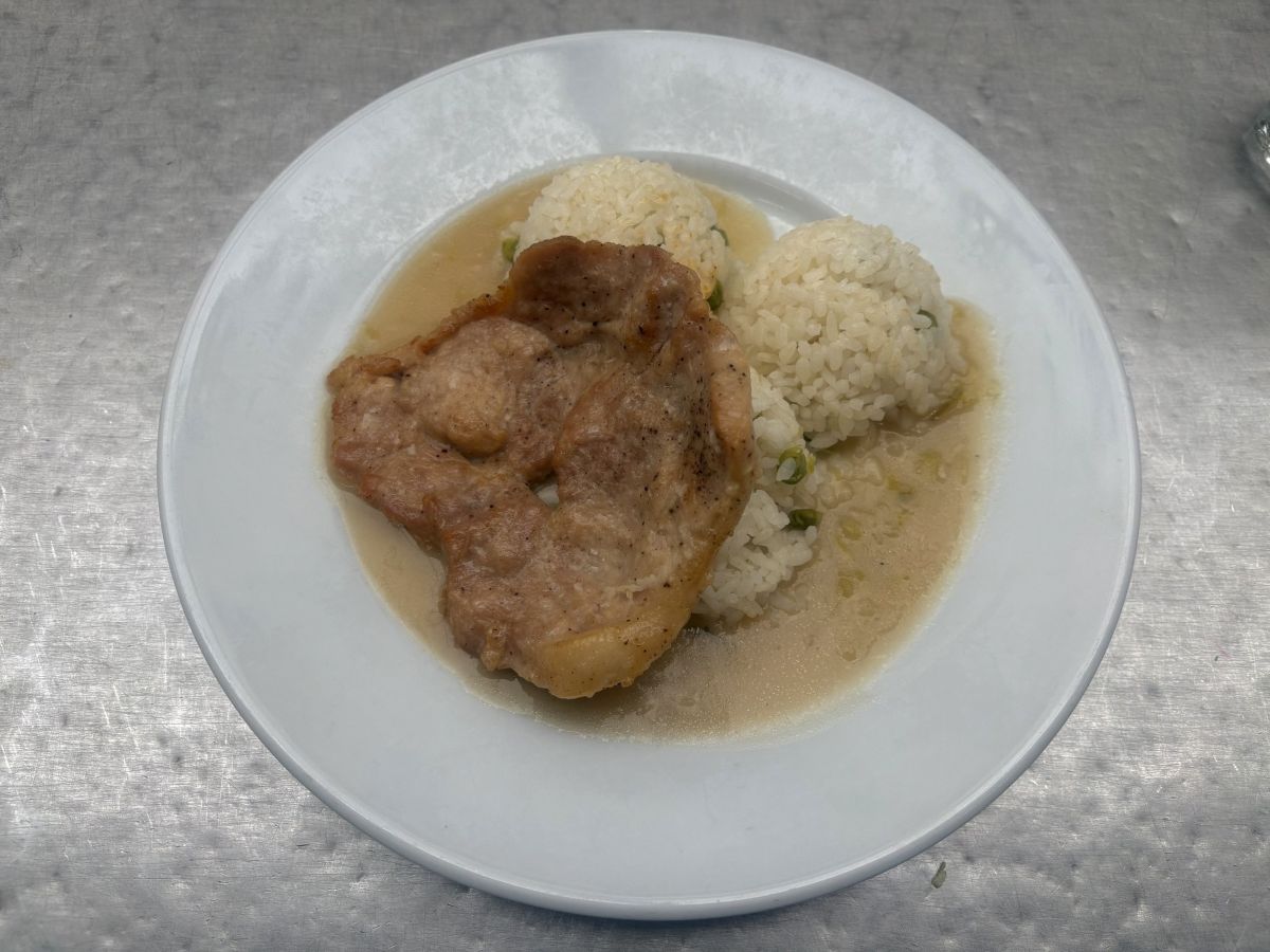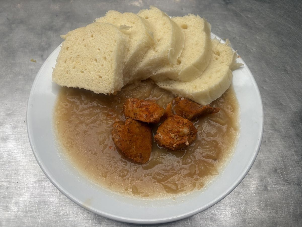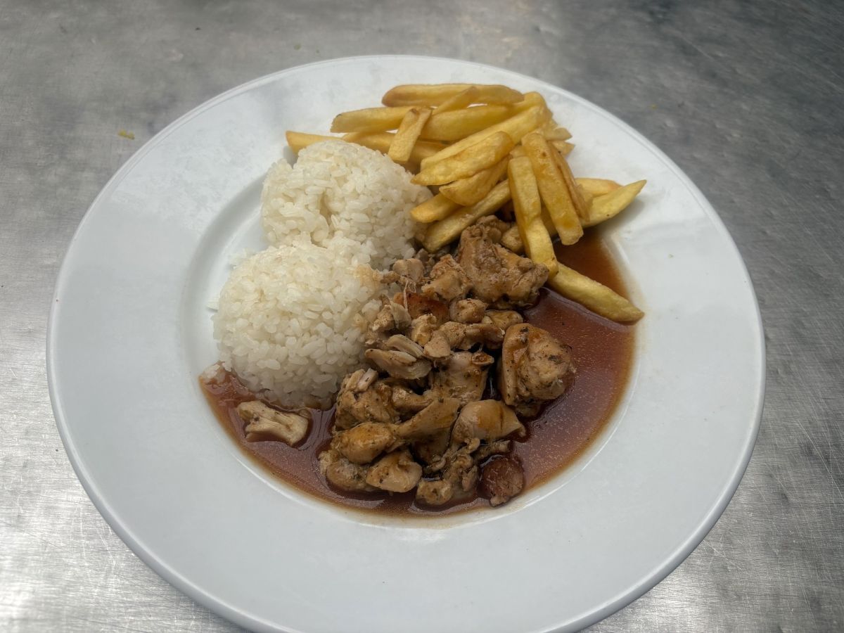Váha: 140/200g Chicken gyros noodles in spicy sauce; 1/2 rice; 1/2 fries; carrot salad with cabbage