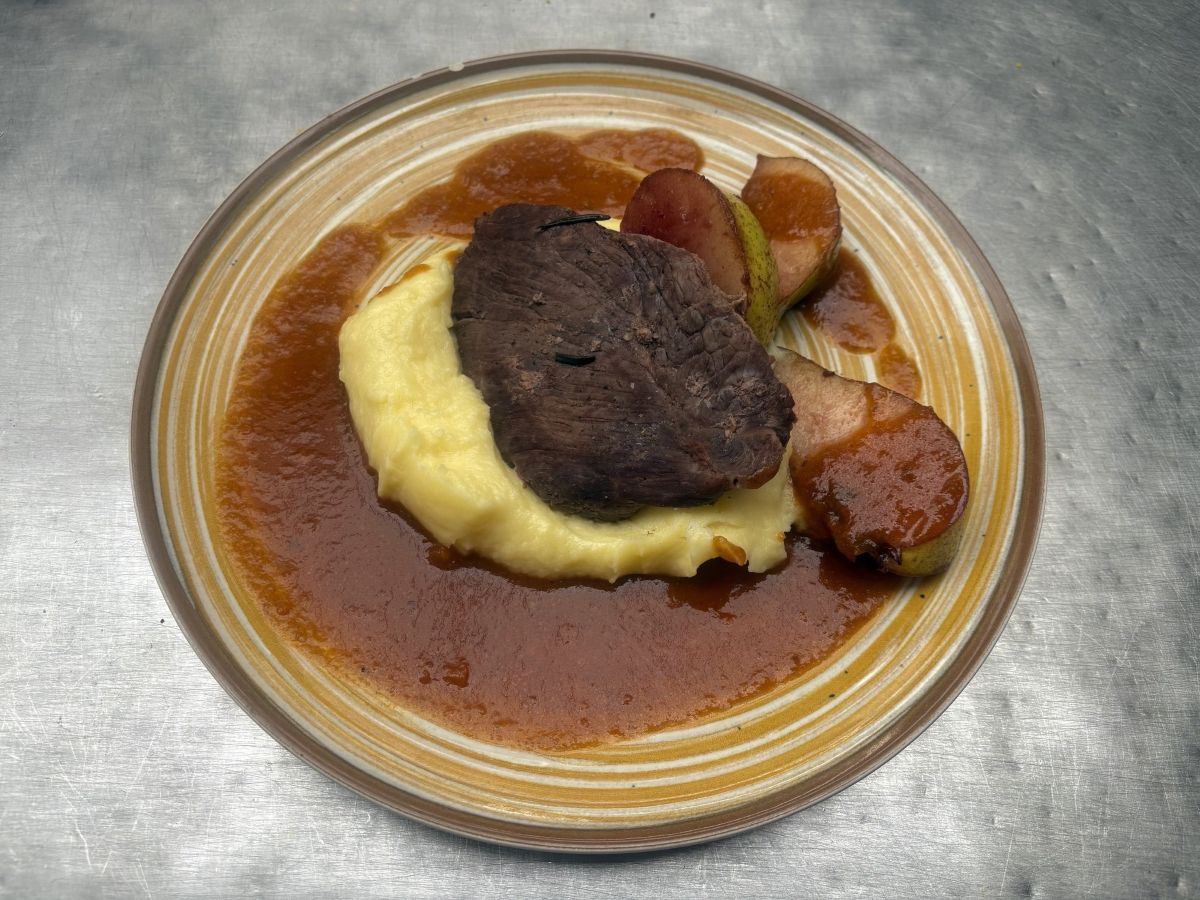 Váha: 150/200g EXTRA MENU: Beef fillet in red wine; mashed potatoes; marinated pear