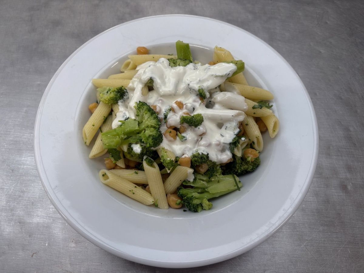 Váha: 380g Pasta salad with broccoli; chickpeas; yogurt dip with blue cheese