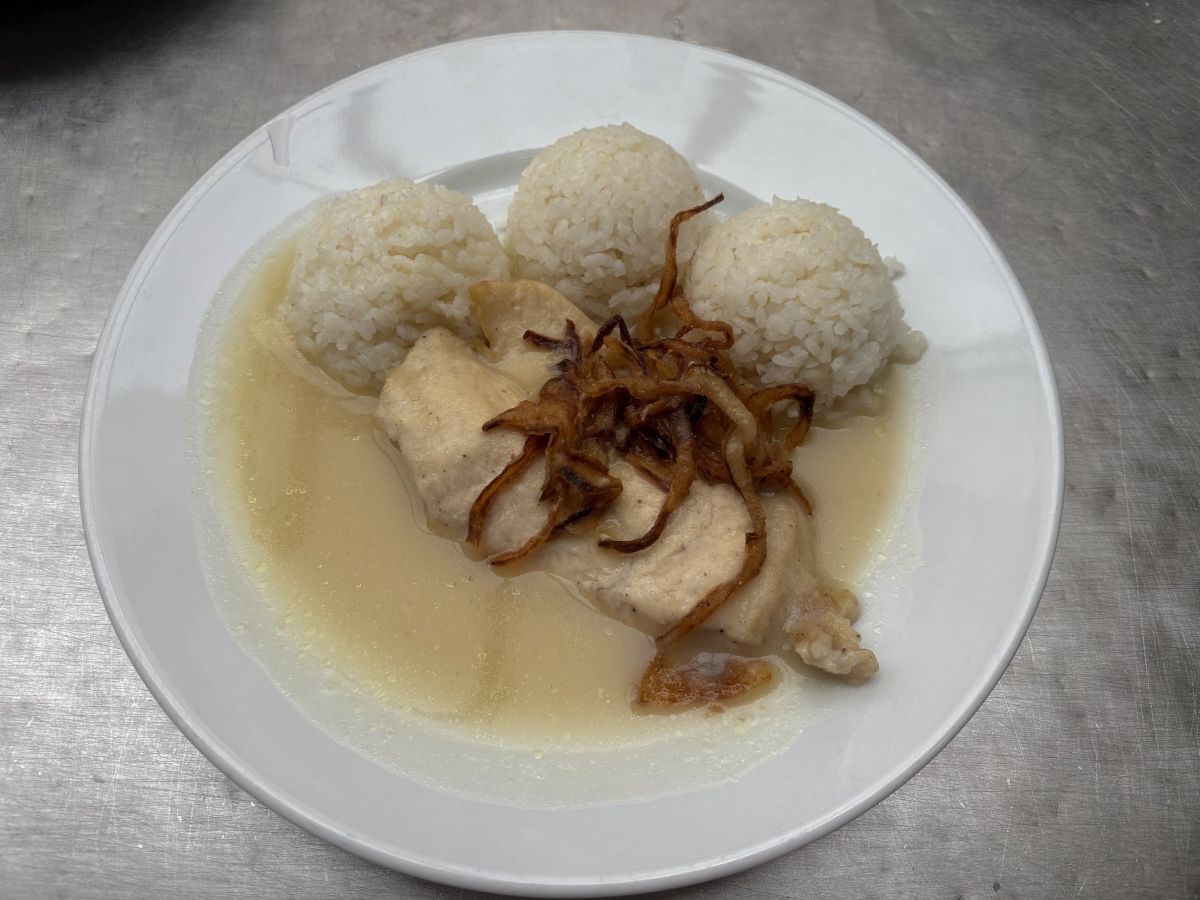 Váha: 140/200g Pork saute; steamed rice; pickle