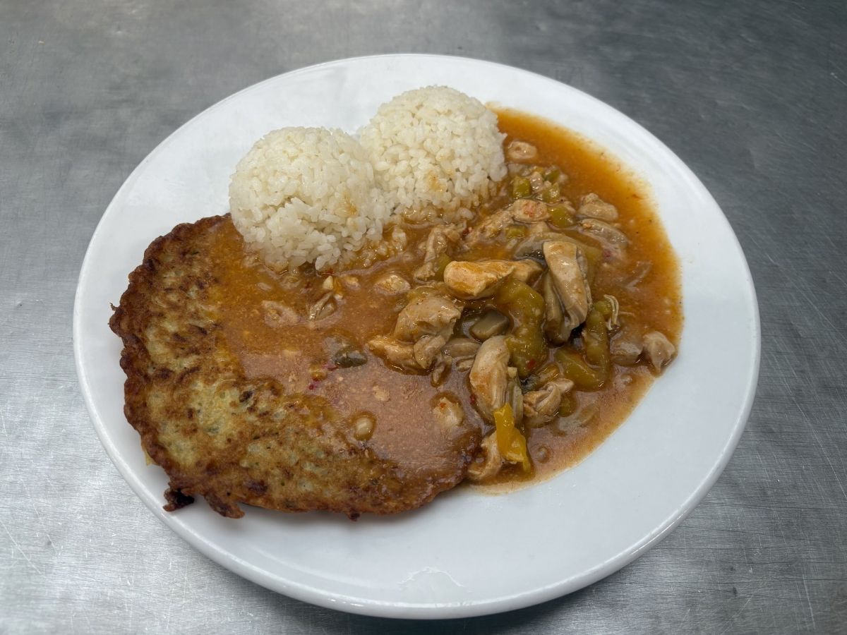 Váha: 140/200g Mildly spicy chicken saute 1/2 pancake 1/2 steamed rice, beetroot salad